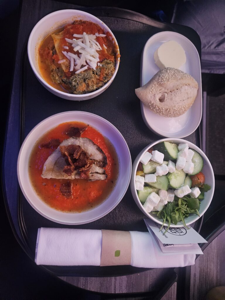 They take your meal order when you get aboard. Soon after the plane took off at 11:10am, I got served the meal. I had a salad, Lasagna, and a pork loin in a tomato gravy that was really good.
