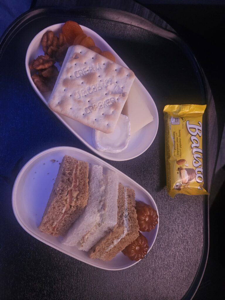 While I ate, I watched John Wick, then after I laid my chair down and took a 3 hour nap. I woke up with about 2 hours to go, and they served us finger sandwiches with walnuts, cheese, and crackers as a pre landing snack.
